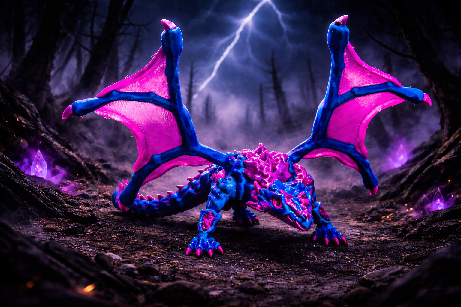 A legendák szerint Félelemszárny az éjszaka ura, akinek árnyéka már messziről rettegést kelt. Szárnycsapásai vihart hoznak, és csak a legbátrabbak mernek a közelébe lépni. Tüzes tekintete és élénk színei minden gyűjtemény középpontjává teszik. Mozgatható, részletgazdag figura, amely nemcsak dísz, hanem igazi fantasy élmény. 3D nyomtatással, gondosan készítve.